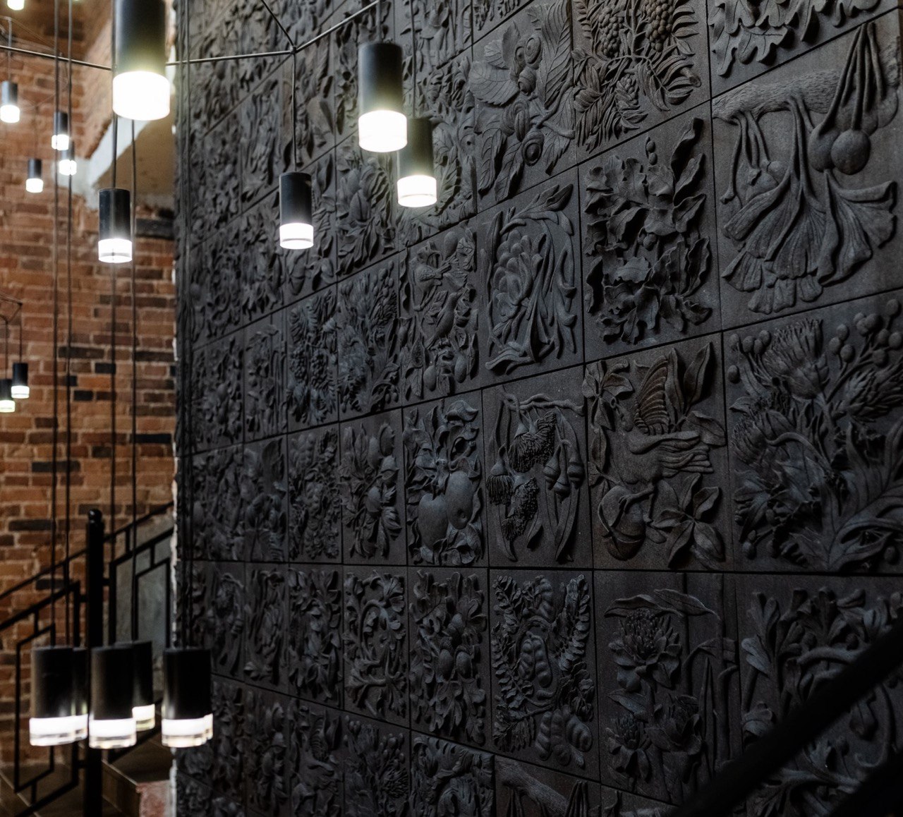 About the project (provided by the applicant) The panel is designed in the Romanesque style and is composed of individual ceramic modules with a natural-botanical theme, assembled into a unified composition like a constructor. Each module can be used independently or combined into different compositions. All module forms were hand-sculpted in modeling clay by the project author, Elena Skutova. Ceramic casting and firing of the modules were carried out at the Borovichi Refractory Plant.