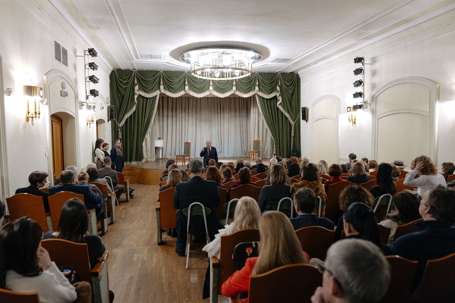 Вступительное слово президента Всероссийского музея А. С. Пушкина Сергея Некрасова, прозвучавшее после приветствий директора музея Ольги Корневой и основателя премии «Золотой Трезини» Павла Чернякова, задало вечеру неожиданную историческую перспективу. Впервые для широкой аудитории была проговорена поразительная деталь: задолго до строительства дома княгини Волконской, в котором снимал квартиру А. С. Пушкин, на этом самом участке жил Доменико Трезини — первый архитектор Санкт-Петербурга. Факт этот, известный специалистам, вне научной среды почти не осмыслен. Между тем, он позволяет взглянуть на значение этого места совершенно иначе: Пушкин провёл последние месяцы жизни там, где за столетие до него формировался ранний облик города. Этот уникальный синтез — когда история архитектуры становится не просто декорацией, а прологом к сценическому действу — создал атмосферу почти мистического ожидания.