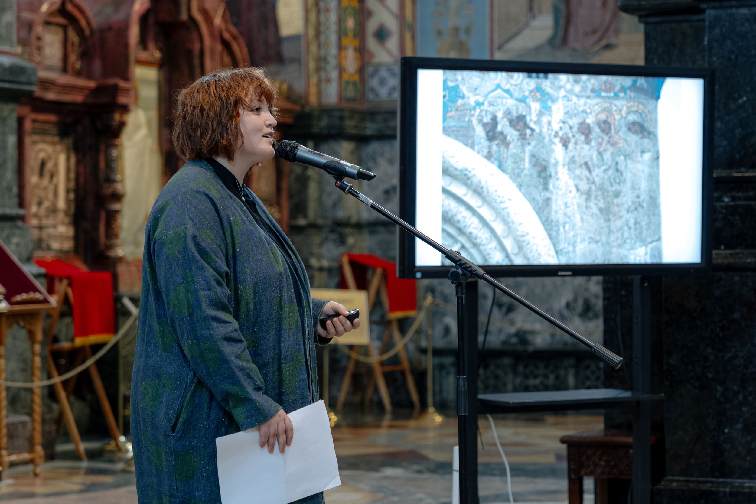 Художник-реставратор мозаичной студии «Кантарель» Ольга Лаврененко сделала доклад о реставрации храмовых мозаик. Среди типичных причин повреждения мозаичных изображений она назвала, например, коррозию арматуры под мозаичным слоем и практиковавшееся в советское время закрашивание религиозных символов. При этом, если проблемы могут быть одинаковыми, то решения порой приходится находить уникальные. В свое время Игорь Лаврененко, основатель студии «Кантарель», разработал для восстановления мозаики Ольгинской больницы в Москве технологию, которая применима только к этому объекту.