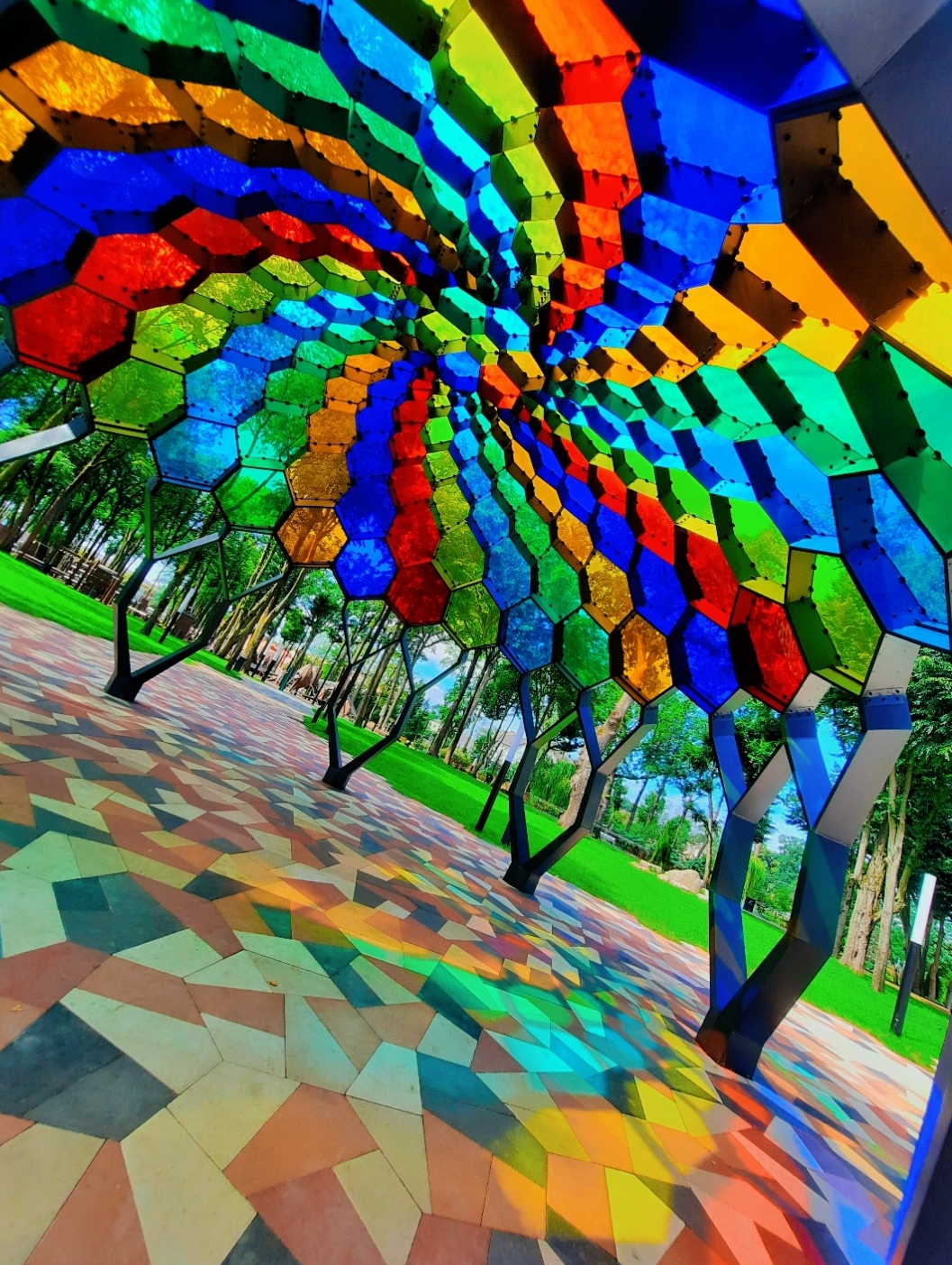 В каждой из вершин сходятся два шестиугольника и пятиугольник. Каждый из пятиугольников со всех сторон окружен шестиугольниками. По задумке Екатерины Фурс (ООО «Другая Архитектура»), автора данной архитектурной формы, купол собран из сот, а сота – это шестигранник.